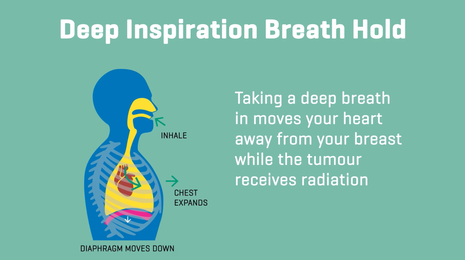 Taking a deep breath in, increases the amount of air in the lungs and also the distance between the heart and the area of the breast receiving radiation treatment. Increasing the distance between the radiation beams and the heart reduces the subsequent potential risk of heart injury that may present three to five years after treatment.